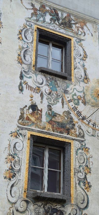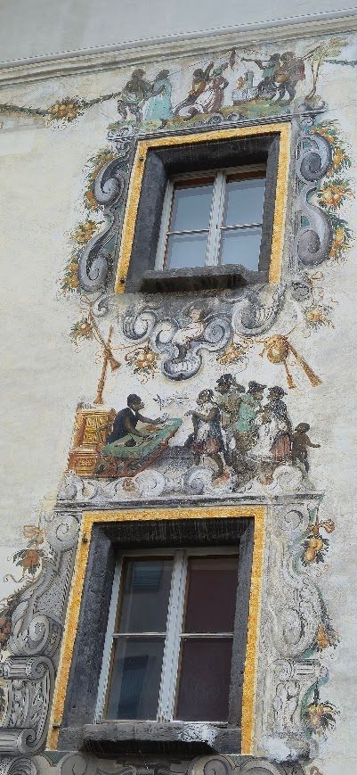 Als je rechts voorbij de toren loopt en voorbij gaat aan het café kom je bij de achterkant van het gebouw met apen fresco's. De zes ramen werden door de Berchtesgadener schilder Johann Faistenauer met apenscènes omlijst. Apen werden graag gebruikt voor satire, vooral op de geestelijkheid. Vroeger was het huis aan alle zijden en ook van binnen beschilderd. Door de eeuwen heen vervulde het gebouw verschillende functies, waaronder woonhuis, herberg en winkelpand.