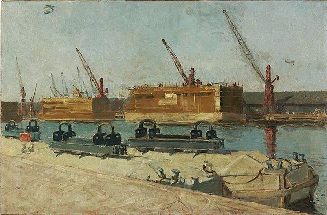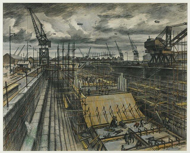 In docks in Engeland worden de caissons in het geheim gebouwd. Op de tekening het