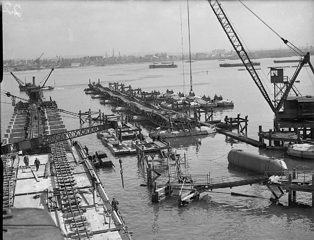 Hierboven de Phoenix caissons voor Selsey Bill aan de Zuidkust van Engeland. Rechtsonder de montage van de bruggen.
