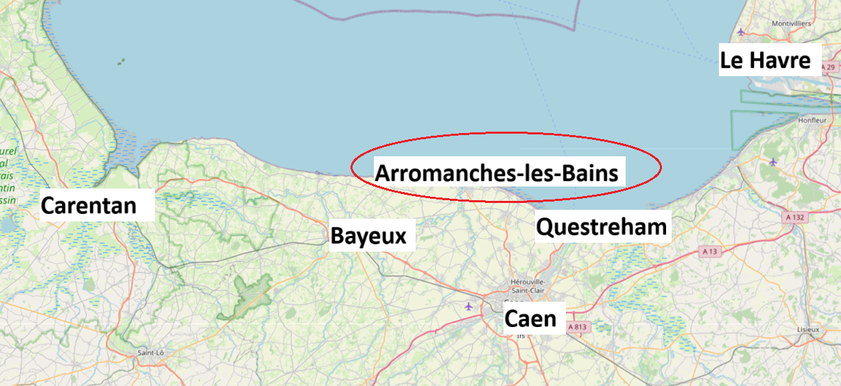 Arromanches, aan de Normandische kust. Tussen strand en zee liggen nog altijd de resten van de indrukwekkende