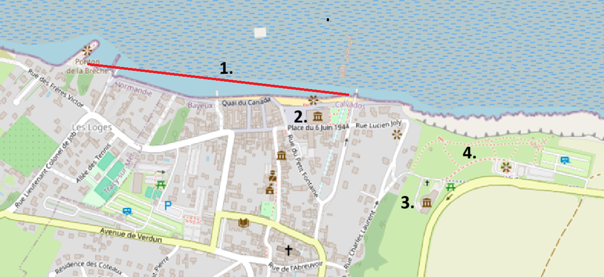 Maak een wandeling langs het strand en de boulevard (Rode lijn op de kaart) . Je ziet de overgebleven op zee liggen en bij eb kun je langs delen van de oude haven lopen. De overgebleven caissons op zee: bij laag tij zijn delen van de oude haven nog zichtbaar in het water – stille getuigen van het grootschalige militaire project.