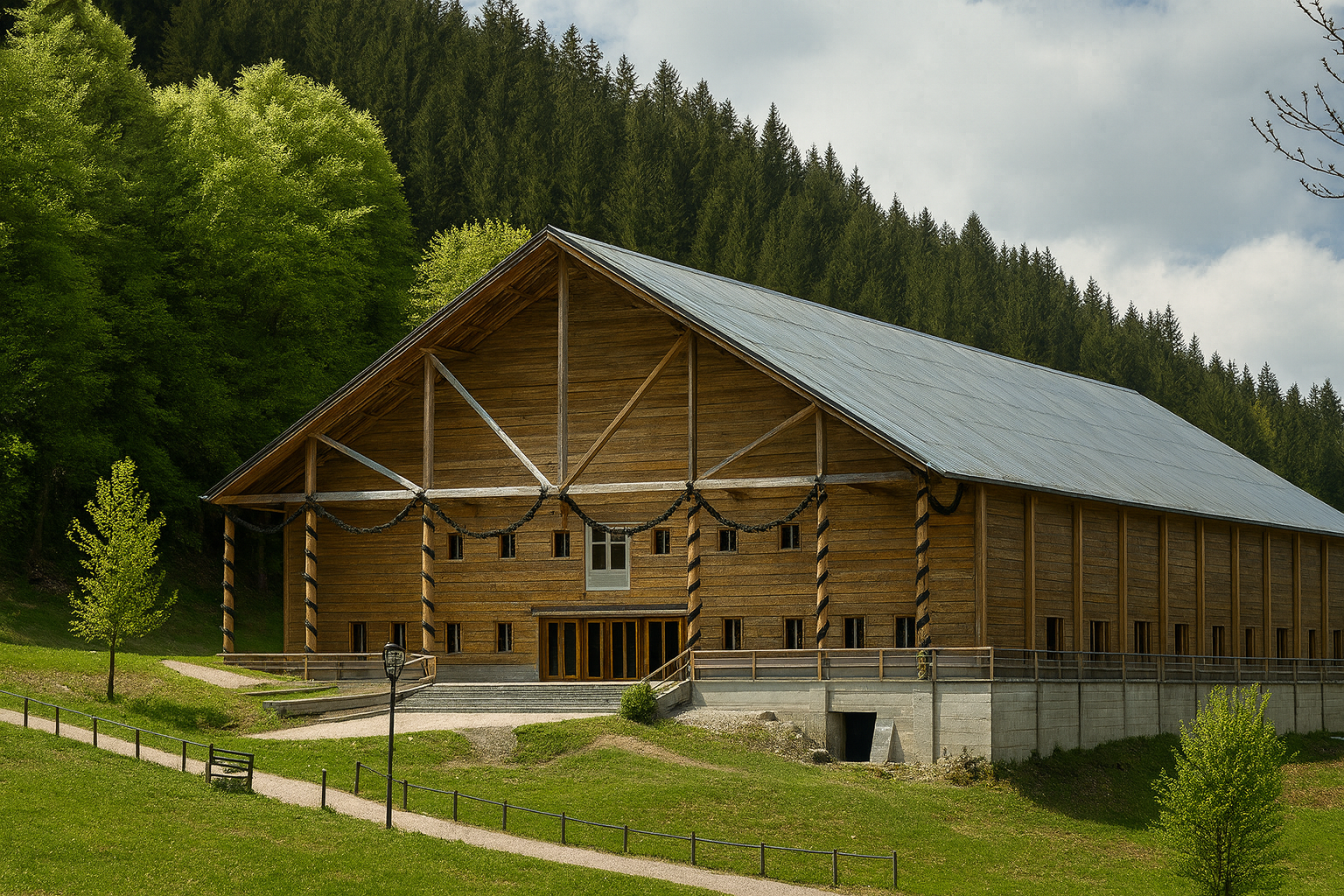 Architectonisch viel de hal op door haar grote afmetingen, eenvoudige houten constructie en een steil zadeldak dat het hele gebouw overspande. Hoewel het uiterlijk deed denken aan een reusachtige schuur, was het interieur ingericht voor grootschalige voorstellingen.