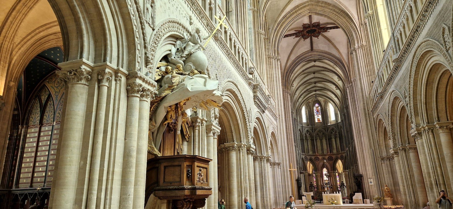 De binnenkant van de kathedraal van Bayeux is even indrukwekkend als haar gevel. Zodra je de zware houten deuren doorgaat, word je verwelkomd door een hoge, lichtovergoten ruimte waar de gotische bogen en zuilen een gevoel van rust en verhevenheid oproepen.