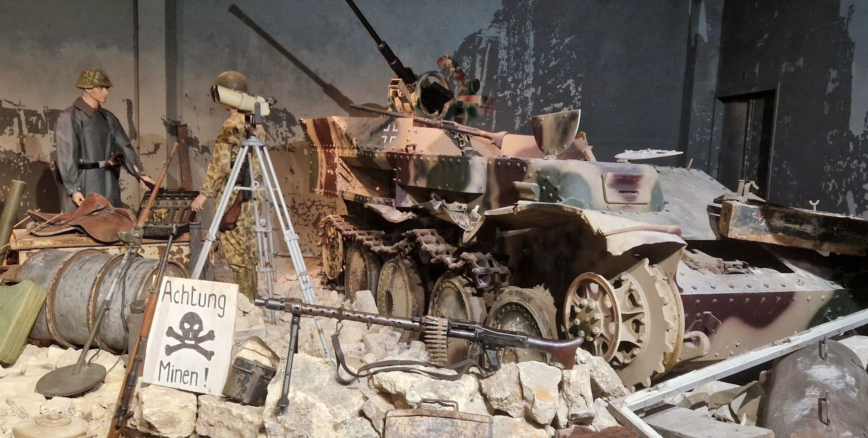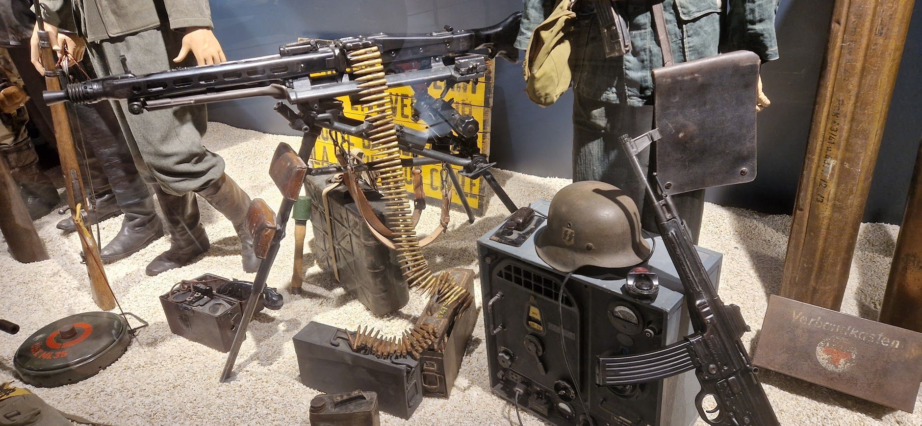 Binnen vind je een rijke verzameling van originele uniformen, wapens, voertuigen, kaarten en persoonlijke voorwerpen van soldaten uit verschillende landen.