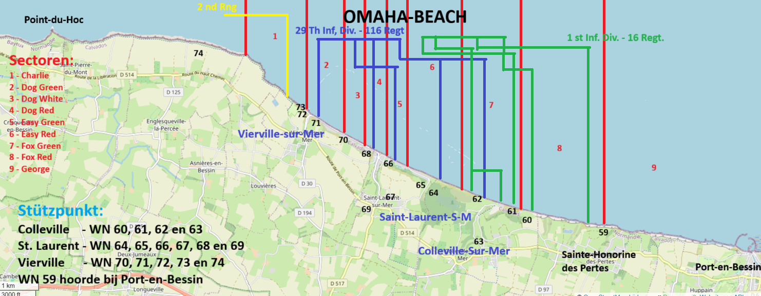 De drone cirkelt boven en rond de belangrijkste Duitse verdedigingspunten — de Widerstandsnester WN60, WN61, WN62, WN64, WN70, WN72, WN73 en WN74 — en laat zien hoe deze posities het geallieerde vuur en bloedvergieten op 6 juni 1944 bepaalden.