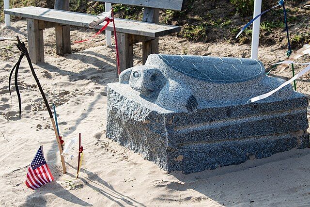 Het monument staat op een rustige plek boven het strand en bestaat uit een bronzen schildpad, een heilig en betekenisvol symbool in veel Native American-culturen. De schildpad verwijst naar bescherming, kracht en het dragen van geschiedenis — passend voor een plek die herinnert aan de offers van Shay en zijn mede-inheemse militairen.